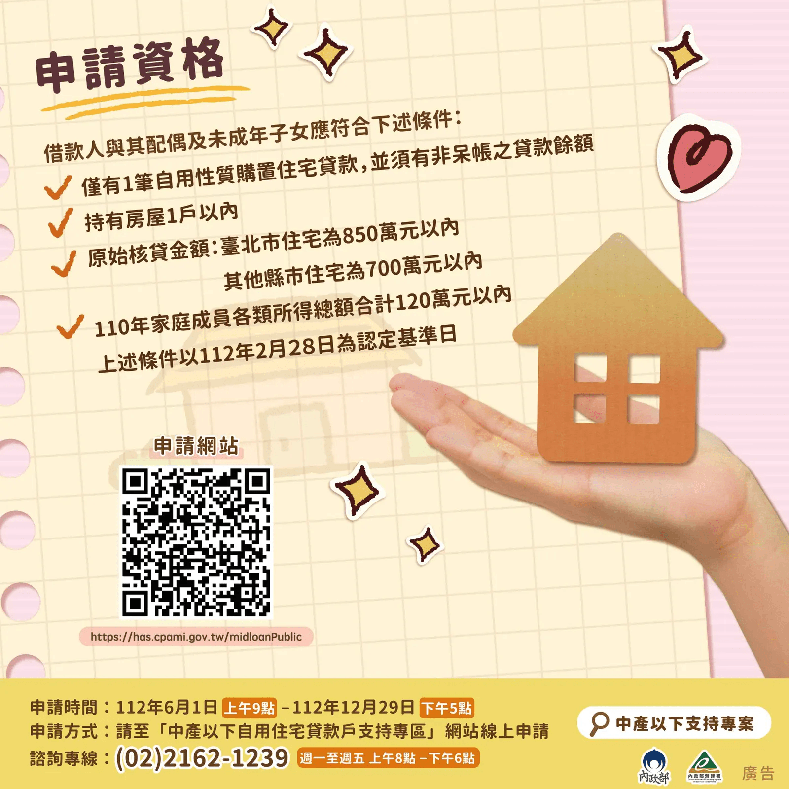 內政部強調,此次住宅貸款支持方案,主要是補助中低薪以下民眾減輕疫情及通膨下的生活負擔,不是用於鼓勵買房,對未來房市影響不會太大。